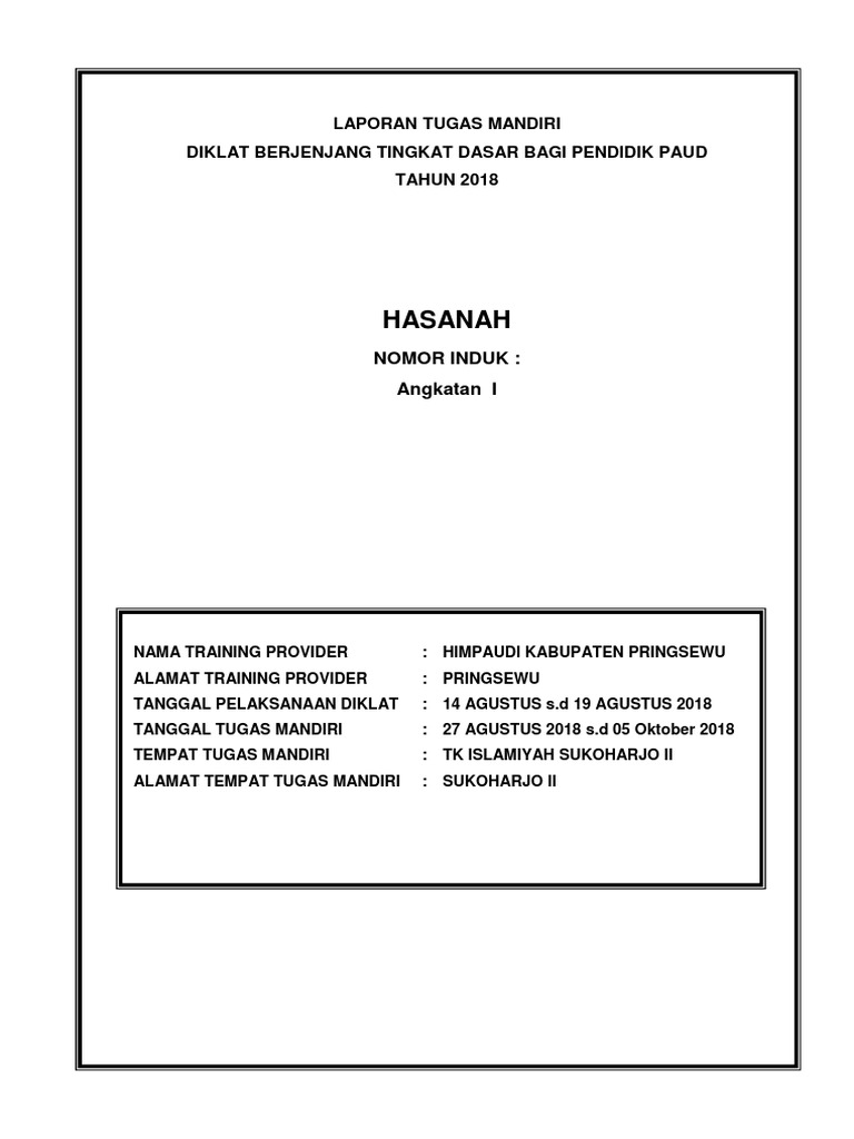 Video ini dibuat untuk memenuhi salah satu tugas mandiri diklat guru pendamping tingkat lanjut Gunakan tombol download yang tersedia kemudian buka link download yang muncul terbaru contoh pengisian raport paud narasi k13. Lampiran penyusunan tugas mandiri diklat paud tingkat dasar 10 maret 2015. Demikianlah pembahasan yang dapat kami sampaikan mengenai contoh laporan tugas mandiri diklat berjenjang tingkat lanjut paud. Asrama polisi bangkingan lakarsantri surabaya tanggal pelaksanaan diklat :