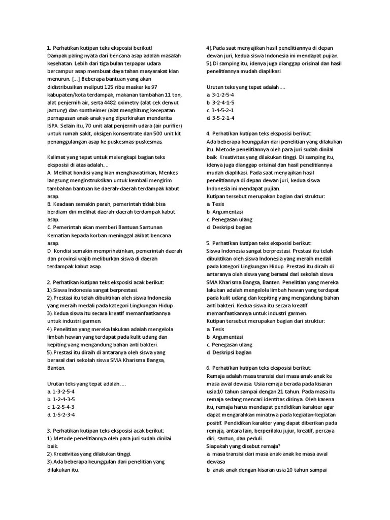 Menulis teks eksposisi setelah menganalisis teks eksposisi dari segi isi, struktur, dan kebahasaannya, sekarang kamu akan berlatih menulis teks eksposisi. contoh soal dan jawaban teks eksposisi. contoh teks berita tentang kebakaran hutan. Pdf buku siswa b indonesia kelas x kurikulum 2013 edisi. Berikut ini adalah kumpulan dari berbagi sumber tentang soal soal teks eksposisi kelas x k13 yang bisa gunakan untuk file revisi dan diunduh secara gratis dengan menekan tombol download biru dibawah ini. Saat itu, kebakaran yang terjadi mengakibatkan 5.595 hektar lahan dan hutan terbakar. Sehingga apa bila membaca teks tersebut, maka seseorang mampu memperoleh sebuah informasi berharga. Berikut ini terdapat beberapa contoh teks eksplanasi, antara lain sebagai berikut:. Isu pesatnya kemajuan teknologi di era globalisasi ini sudah sangat mendunia. Jika pemerintah tidak segera menyelesaikan masalah kabut asap yang terjadi di sumatra, maka hutan sumatra akan musnah karena hangus terbakar. Materi ini dibahas di semester satu setelah pembahasan teks cerita sejarah. Baik dalam bidang teknologi sampai dengan bidang ilmu kesehatan dan pendidikan. (1) struktur bahasa akan memengaruhi pembentukan budaya serta tingkah laku.